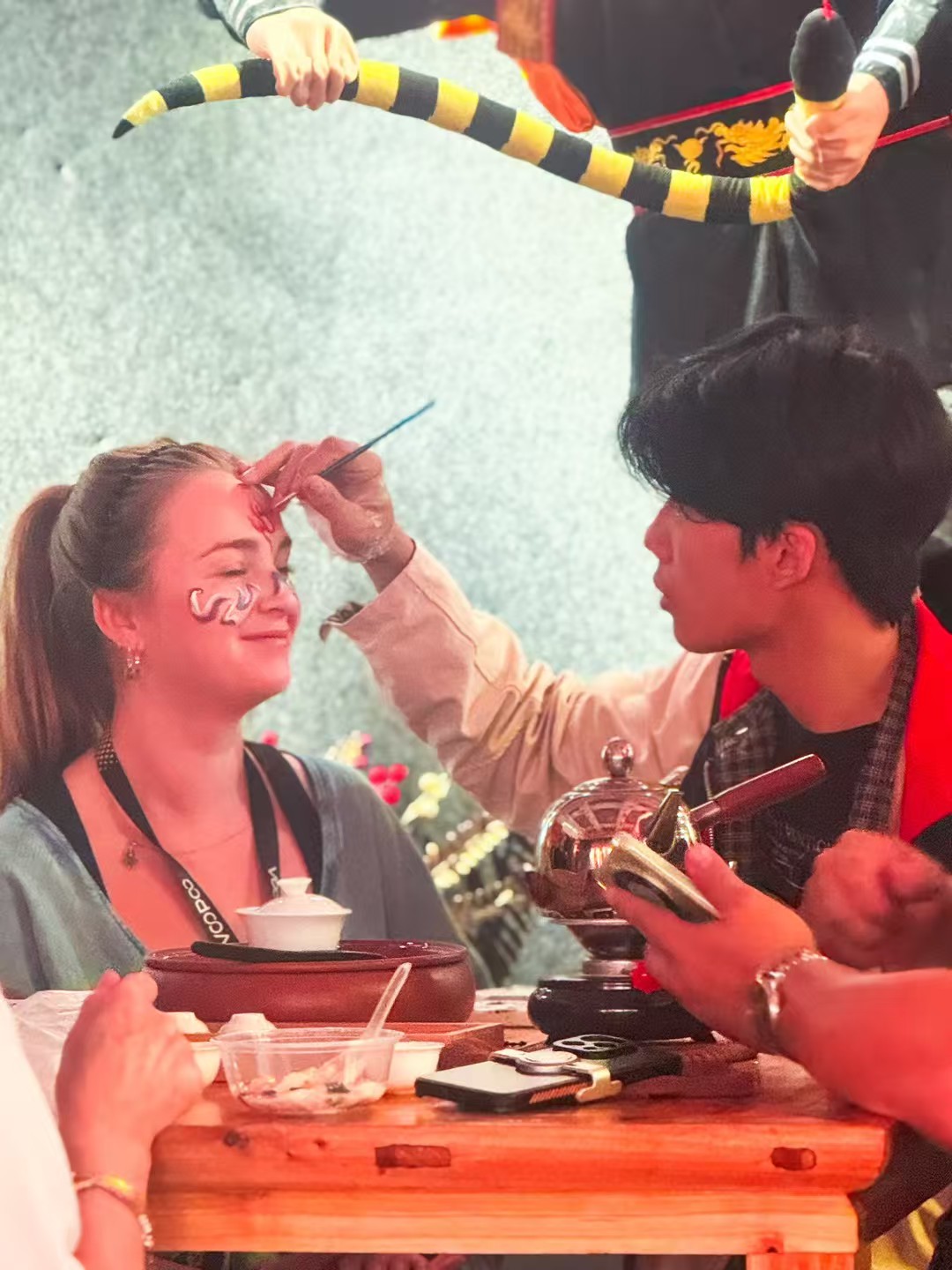 一位化妆师正在为一位外国旅行商化妆,她将学跳英歌舞。受访者供图